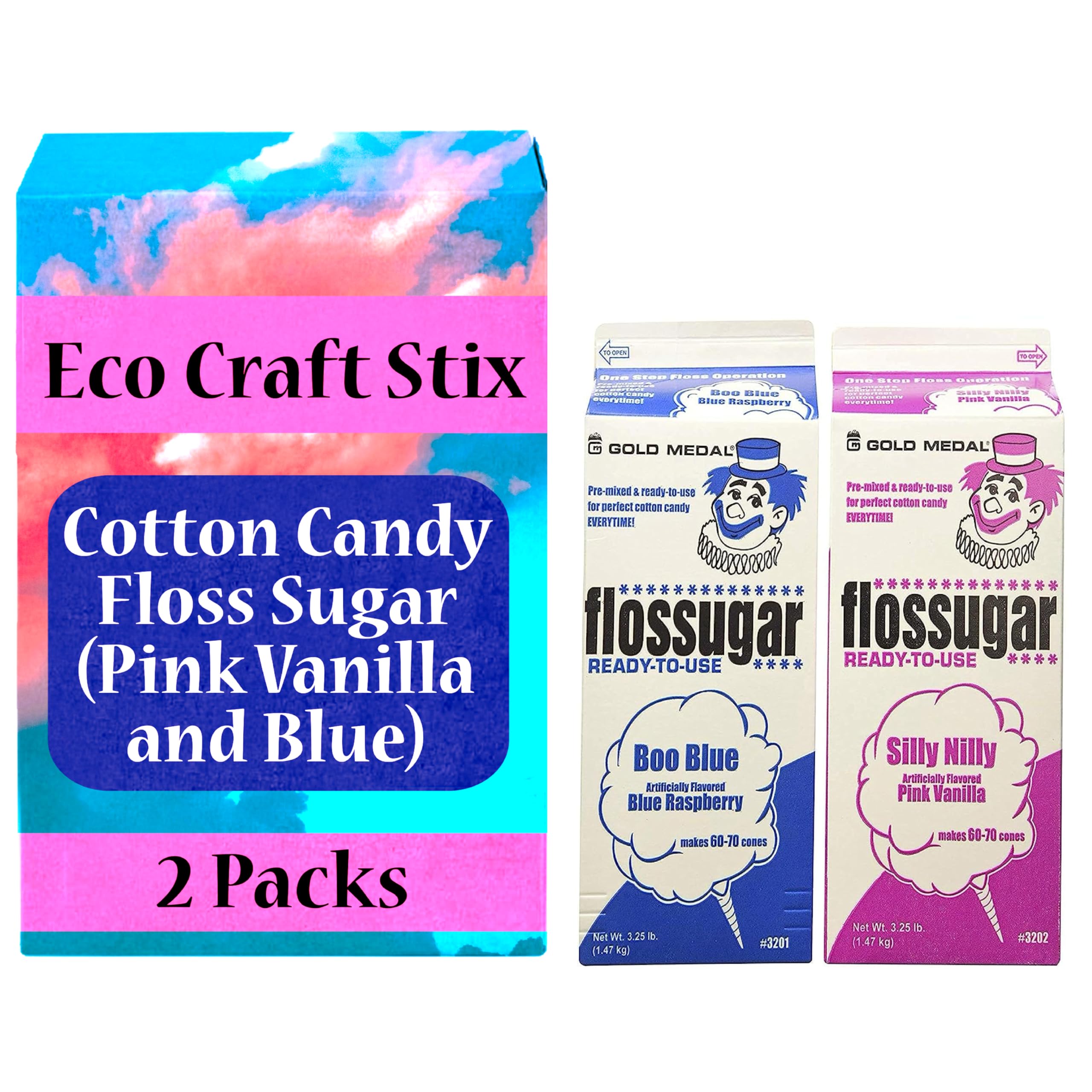 The Eco Craft Stix Cotton Candy Floss Sugar set delivers delicious, sweet flavors in both pink vanilla and blue raspberry, making it perfect for every celebration.